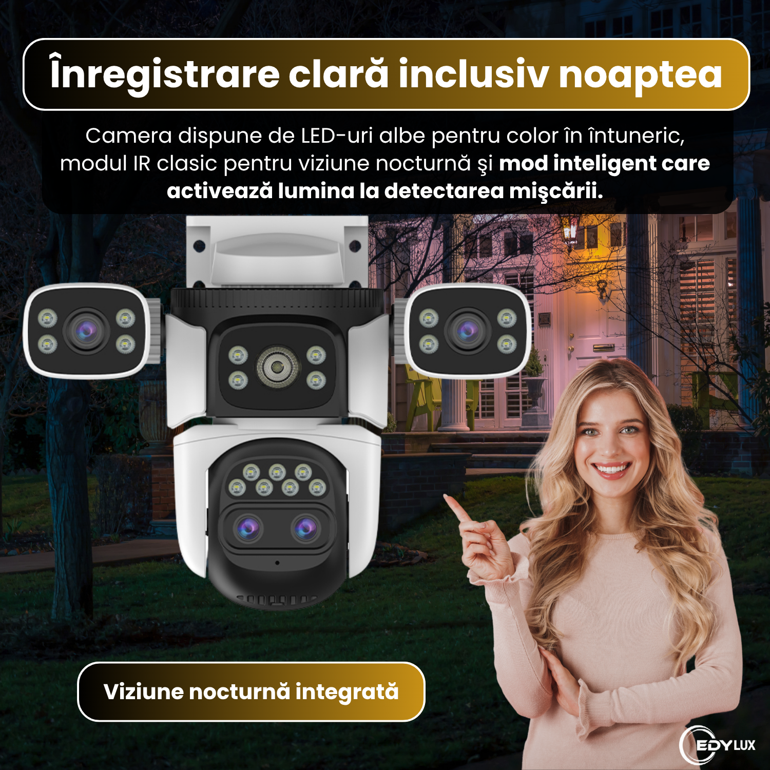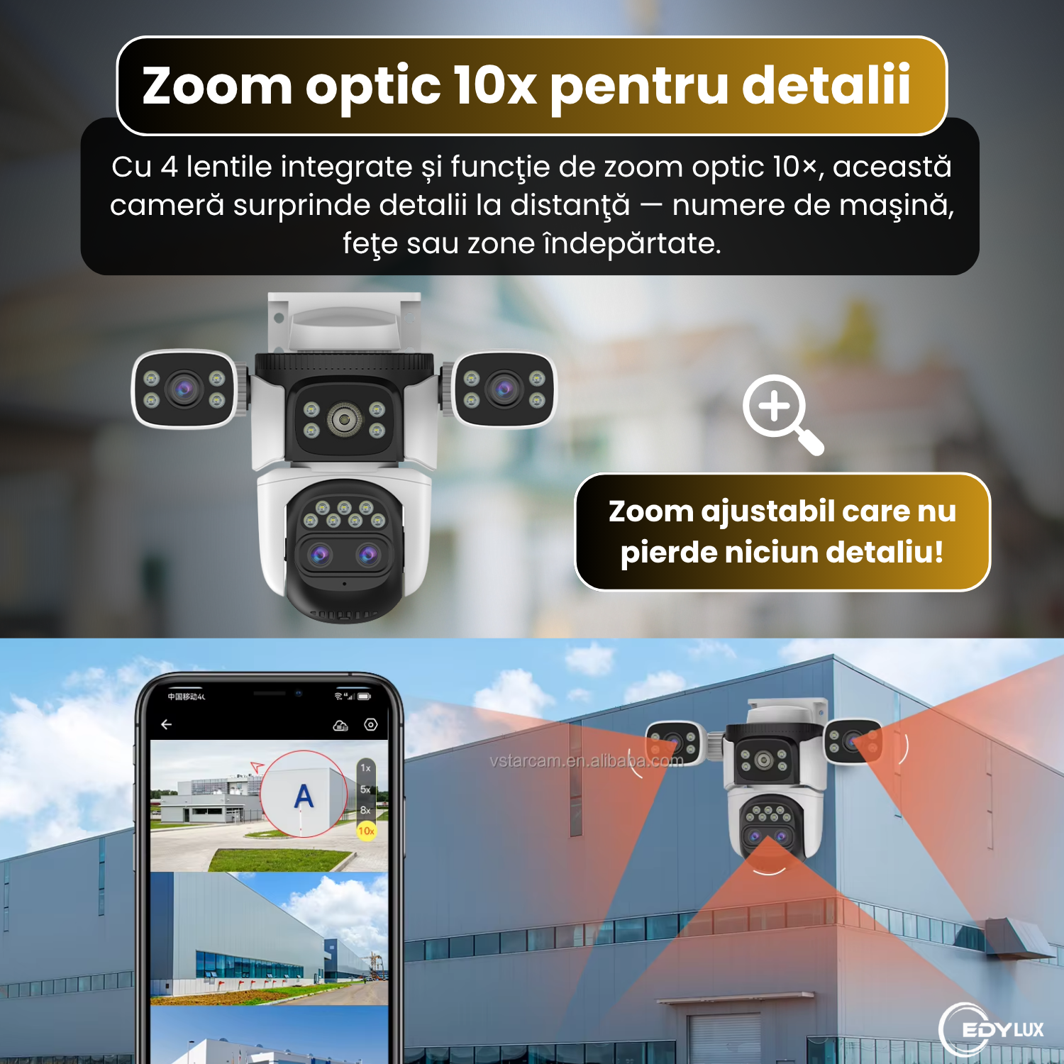 EDYLUX vă oferă imagini clare și noapte, control de distanță și acoperire amplă prin 4 lentile și zoom optic 10X. Comand-o acum.